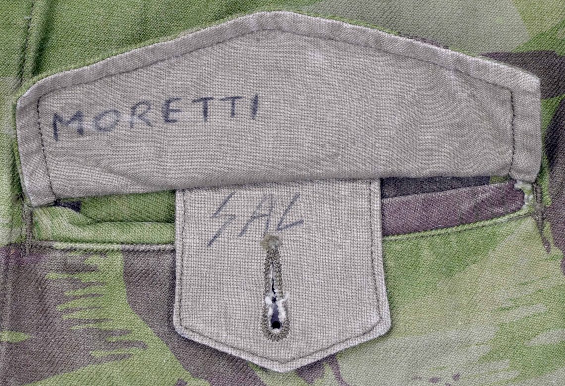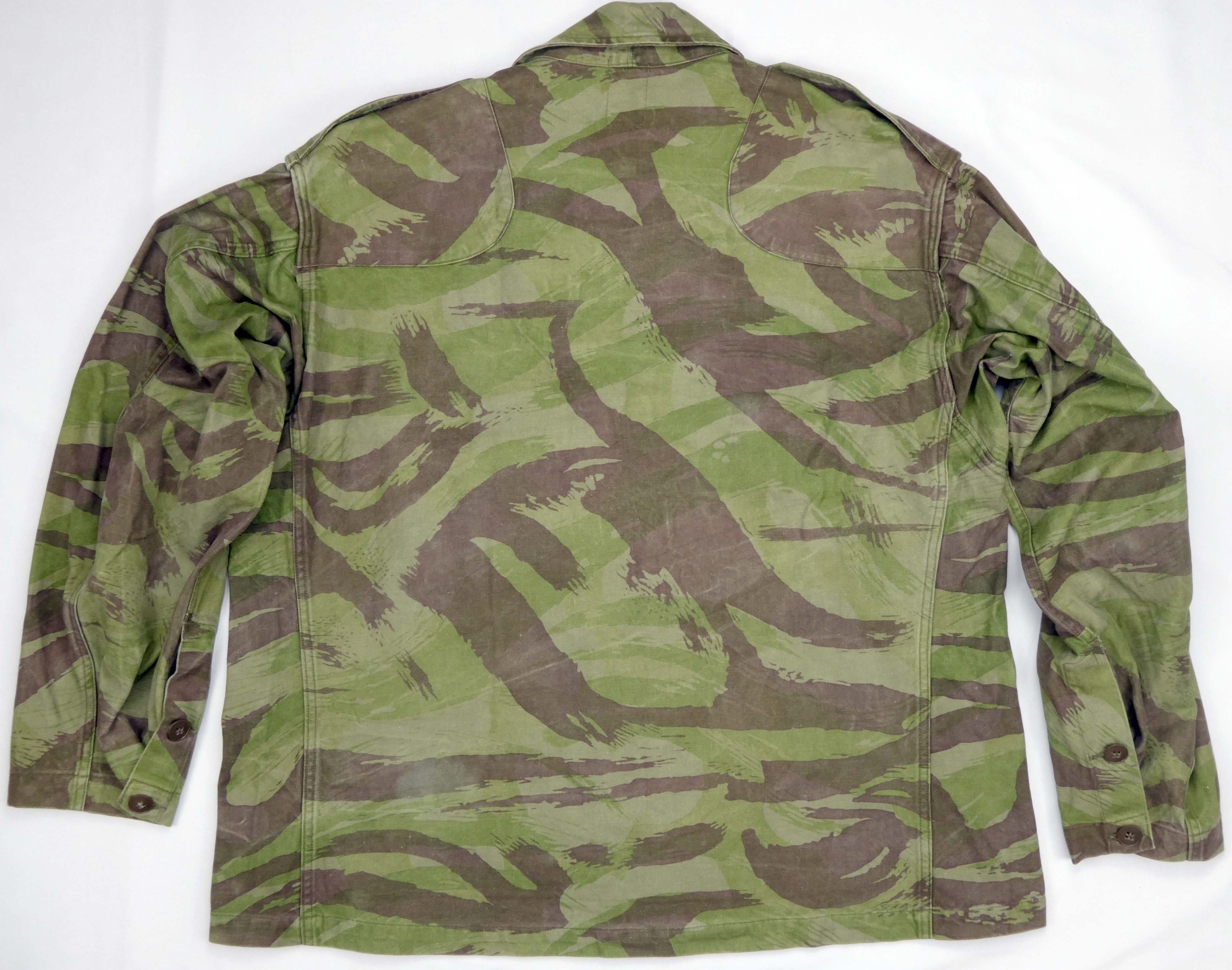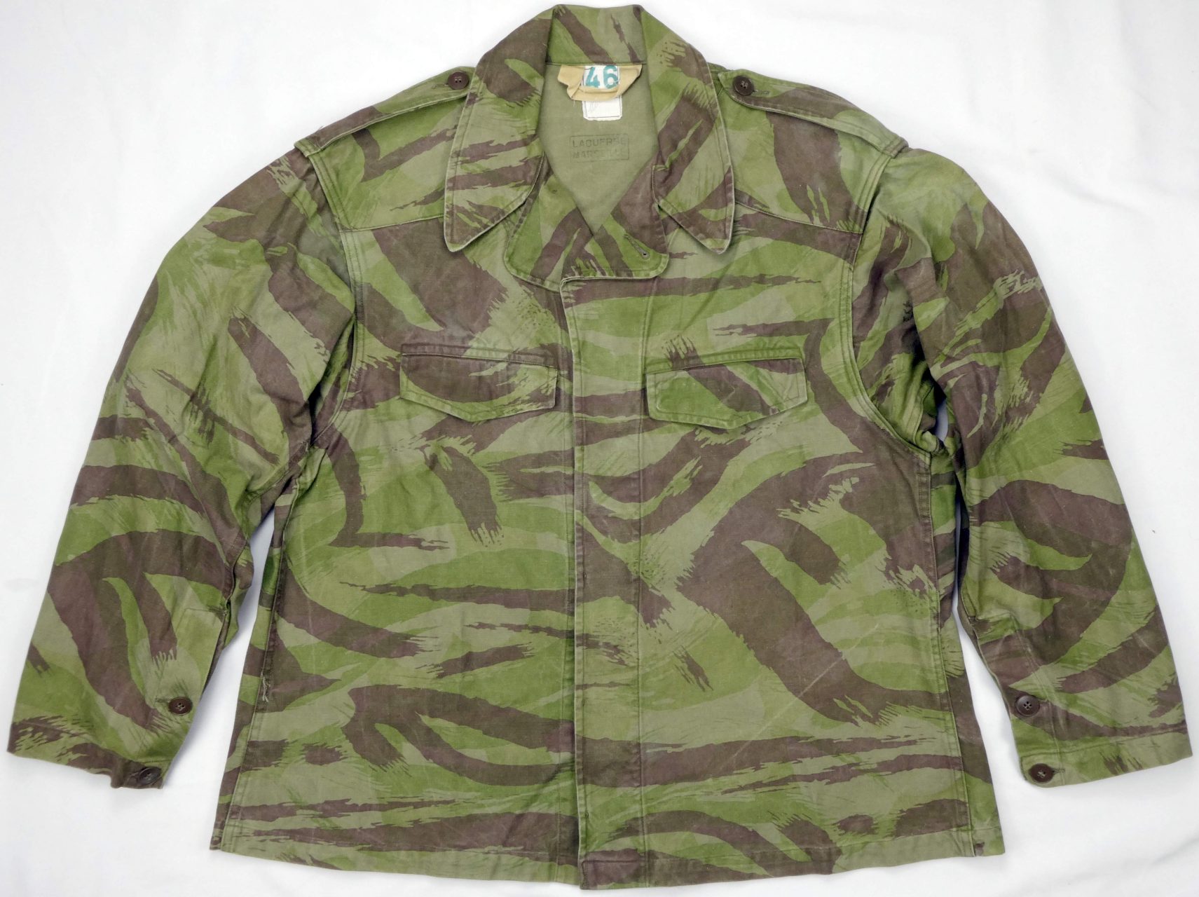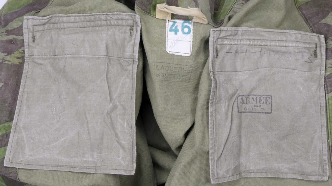 Has lizard camouflage print on a similar poplin fabric to TAP 47/54. The camouflage print is most similar to “A3” on this page: http://vonstuckcamouflage.free.fr/france.php. Shoulder reinforcements are a post-1952 feature. Buttons do not appear to be original to uniform.