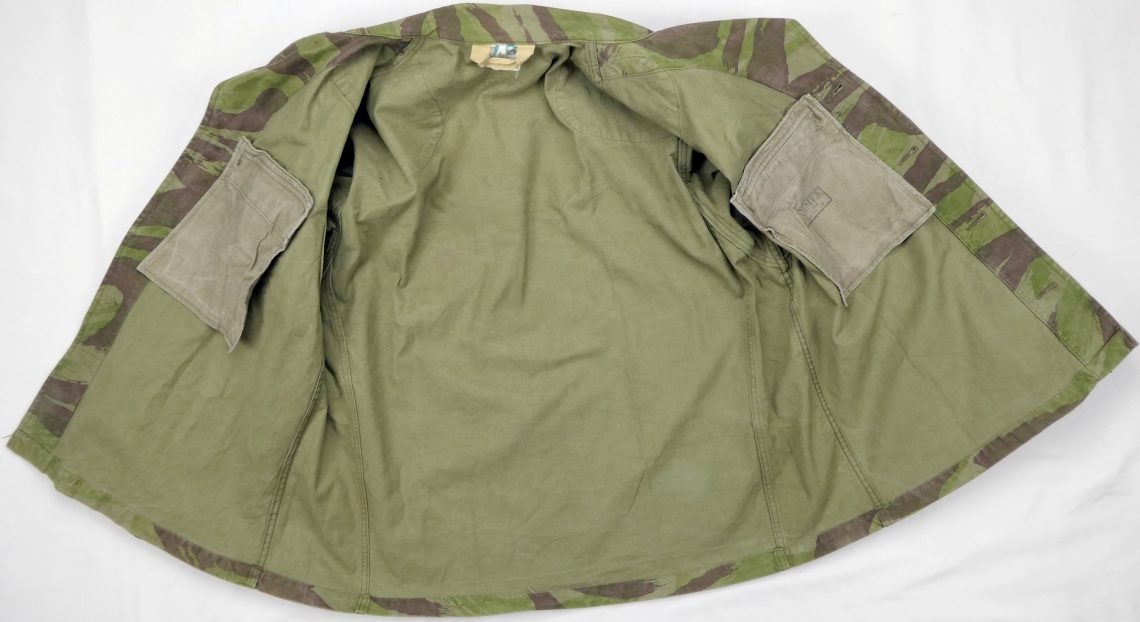 This jacket is most similar to the “C1” version of French Lizard camouflage on http://vonstuckcamouflage.free.fr/france.php. This particular combination of C1 lizard camouflage and Modele Allegee cut was likely copied by the South Vietnamese Marine Corps for their first camouflage uniform, issued in 1958 [1].