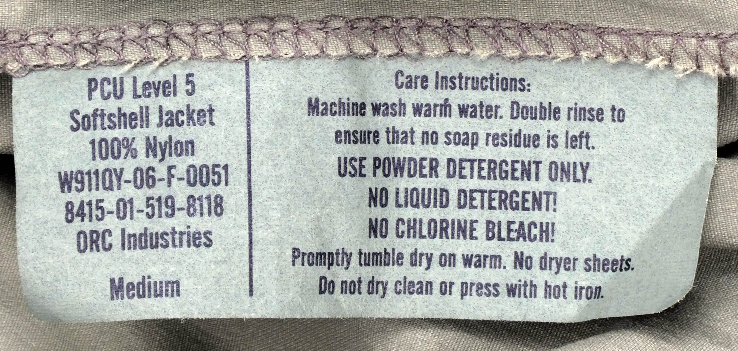 The PCU (Protective Combat Uniform) is a scalable all weather clothing system meant to accommodate a wide range of inclement weather conditions.  The Level 5 parts of the PCU are the most versatile layers and are meant to be nearly general purpose.  While the Level 5 softshells are water resistant, they are not impermeable since they are intended to allow the wearer some ventilation (“breathe”) for comfort.  This breathability also allows them to be dried quickly, especially when body heat is involved to encourage evaporation. [1]