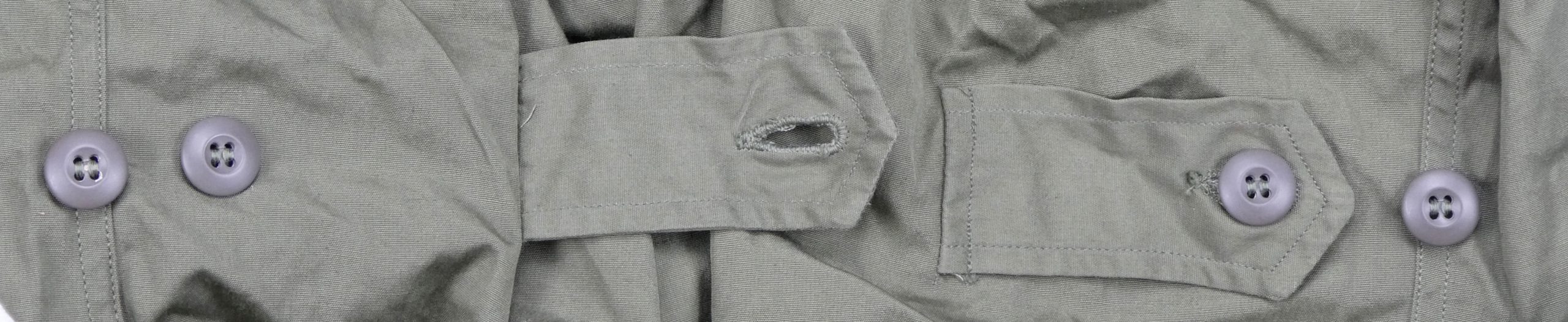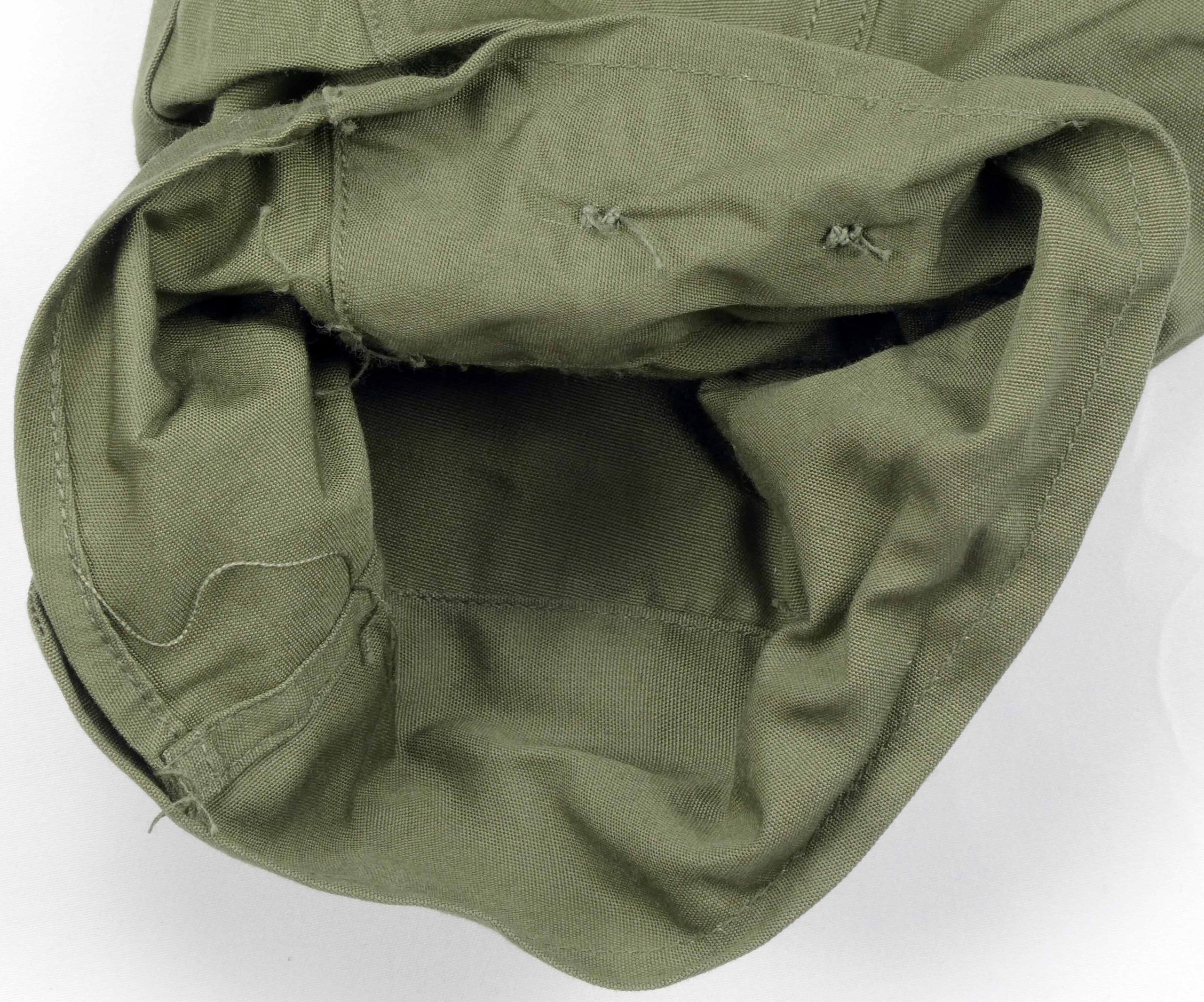 Button fly. This example was probably among the last jungle fatigue pants to be made with a button fly since it was replaced by a zipper starting in late 1967 or early 1968. This coincided with ripstop fabric replacing non-ripstop poplin.