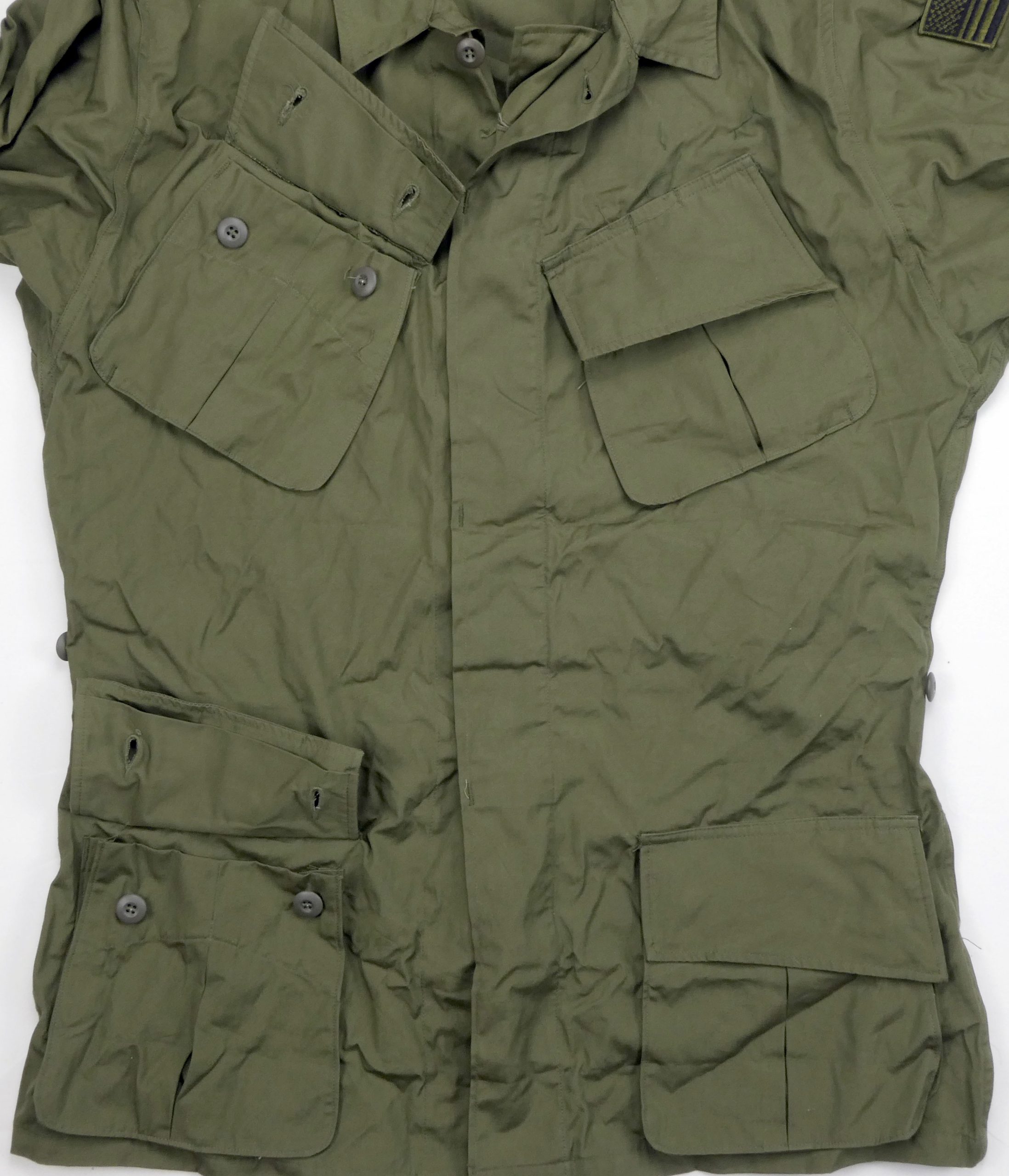 This third pattern jungle jacket was modified into a 2-pocket shirt. The lower pockets were removed so it can be tucked into the trousers. Similarly modified jungle fatigue shirts were used in Southeast Asia during the Vietnam War [2].