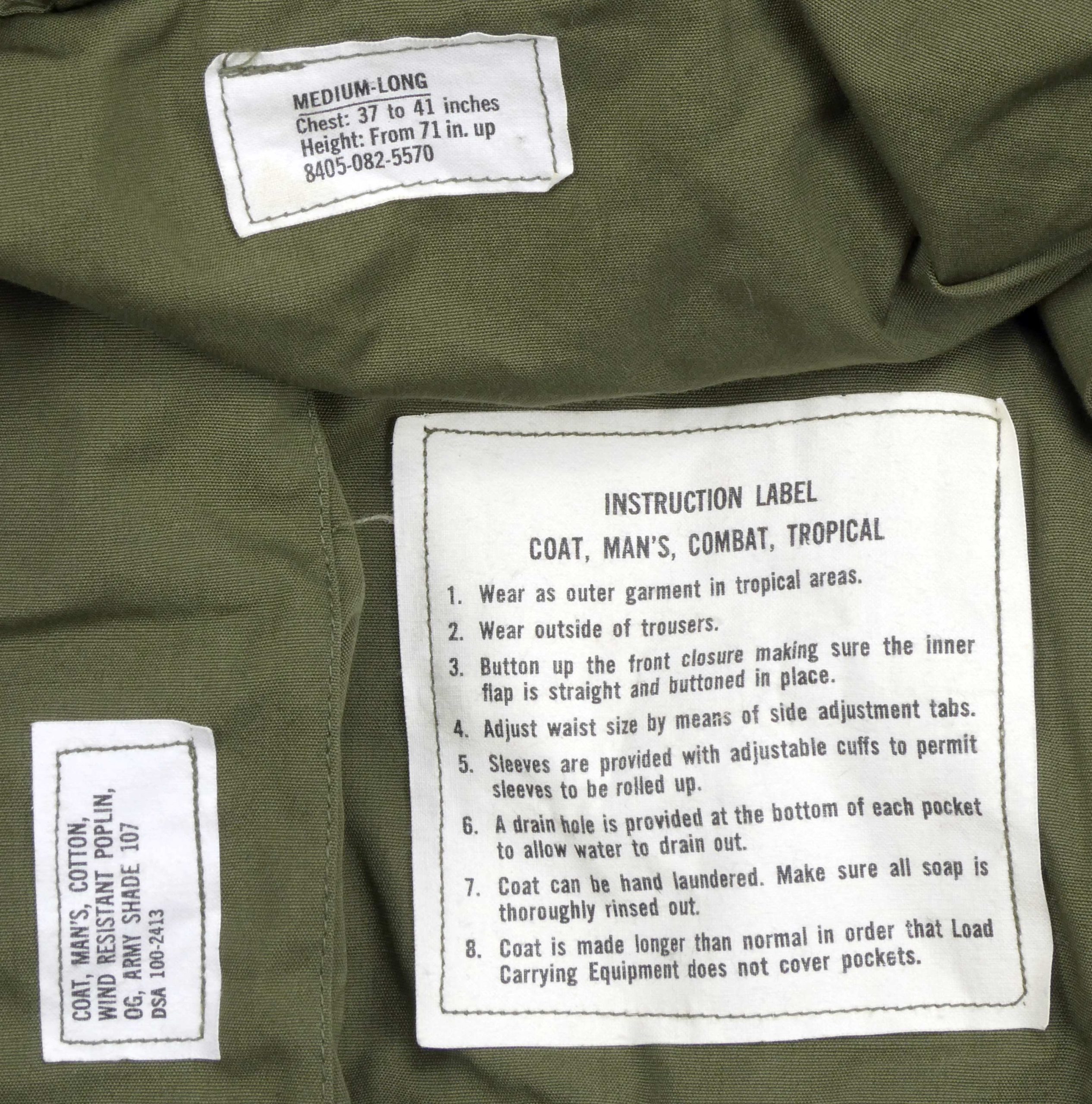 Solid color jungle fatigues were available in three primary “patterns” and in non-ripstop poplin (earlier) and ripstop poplin (later) fabrics. Although all items were supposed to be OG-107 like the sateen uniforms in use at the time, shades often varied depending on fabric batch and wear in the field.