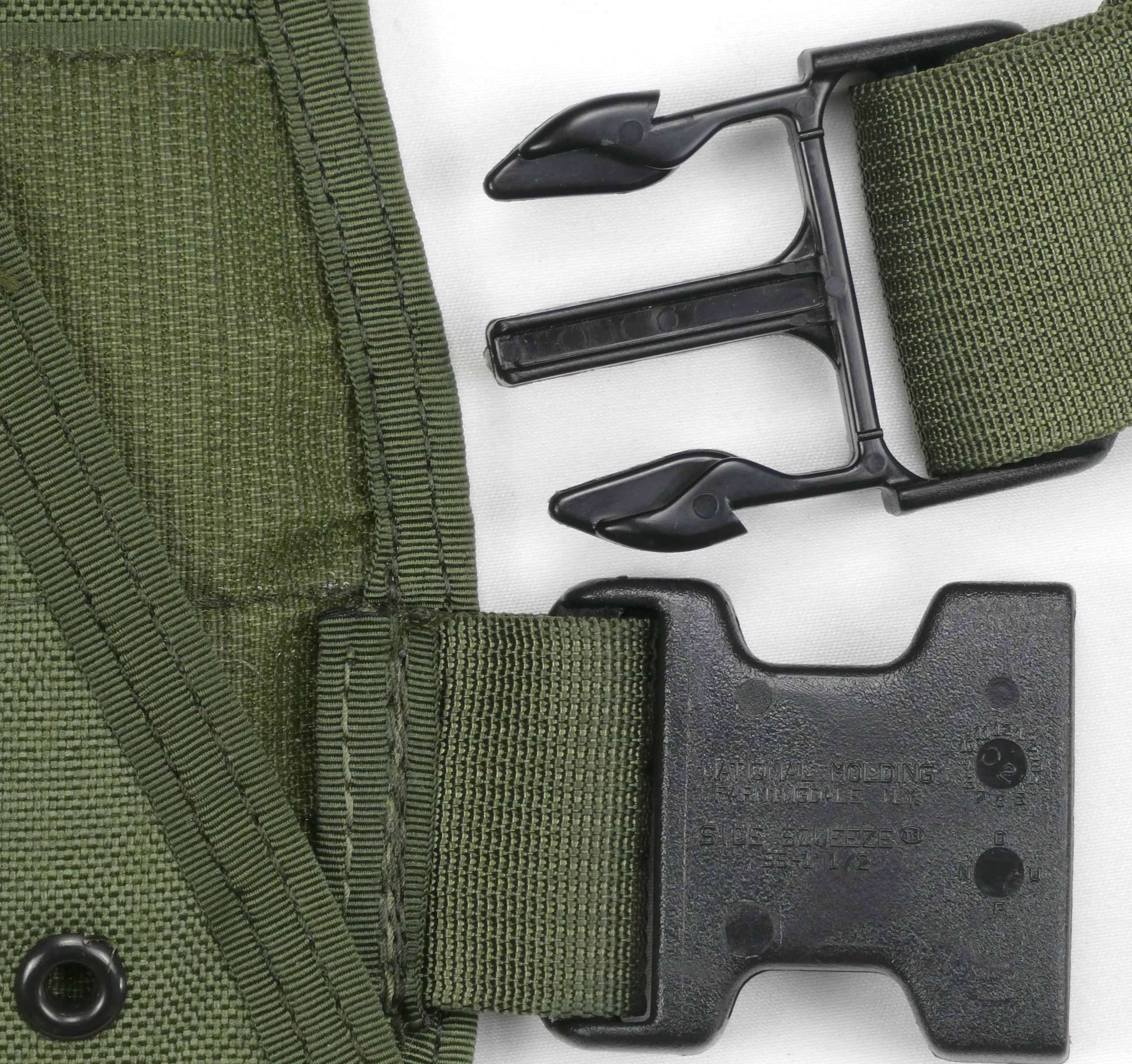 Side straps have elastic material attached to nylon webbing.